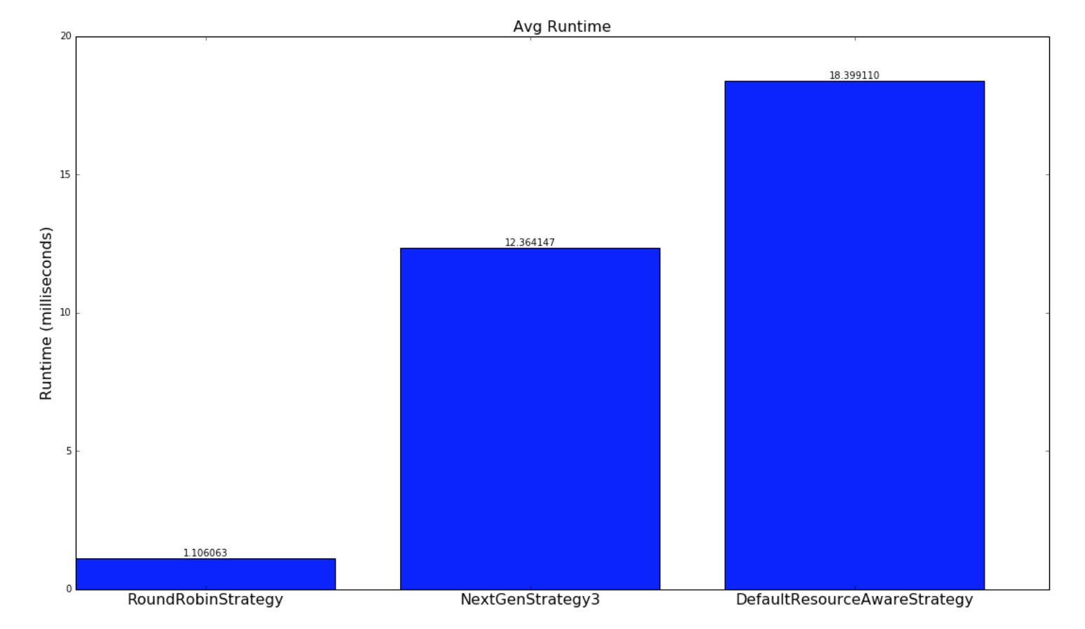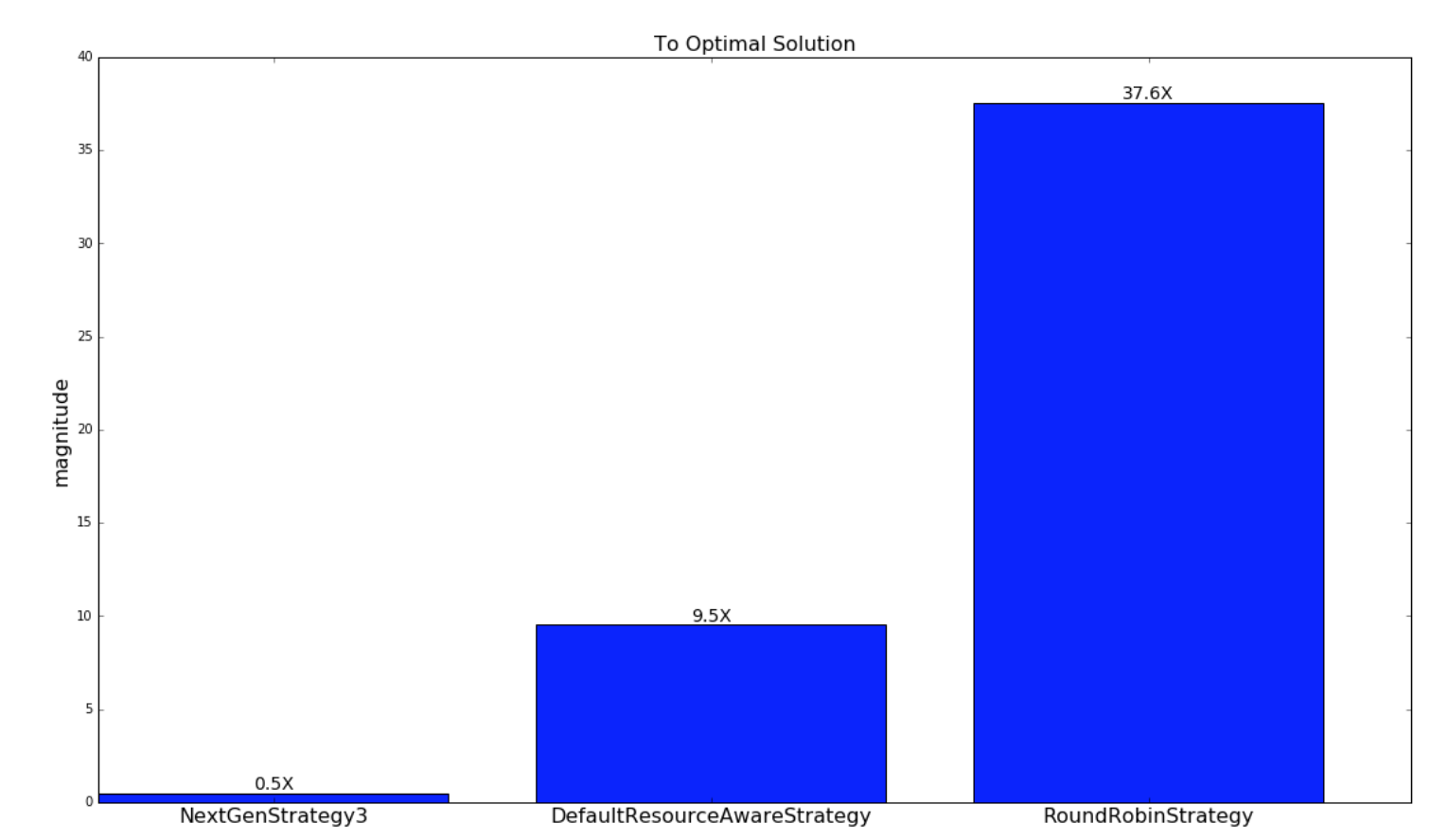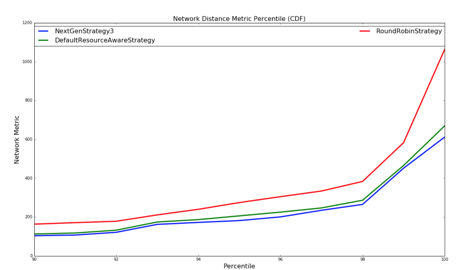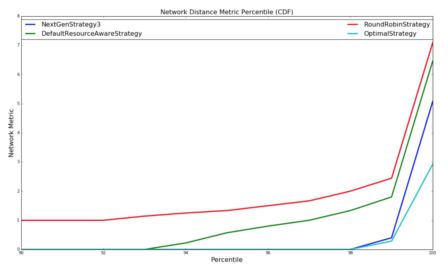 For the experiments involving randomly generated topologies, an optimal strategy is implemented that exhaustively finds the most optimal solution if a solution exists. The topologies and clusters used in this experiment are relatively small so that the optimal strategy traverse to solution space to find a optimal solution in a reasonable amount of time. This strategy is not run with the Yahoo topologies since the topologies are large and would take unreasonable amount of time to run, since the solutions space is W^N (ordering doesn't matter within a worker) where W is the number of workers and N is the number of executors. The NextGenStrategy represents the scheduling strategy with these enhancements. The DefaultResourceAwareStrategy represents the original scheduling strategy. The RoundRobinStrategy represents a naive strategy that simply schedules executors in a round robin fashion while respecting the resource constraints. The graph below presents averages of the network metric. A CDF graph is also presented further down.