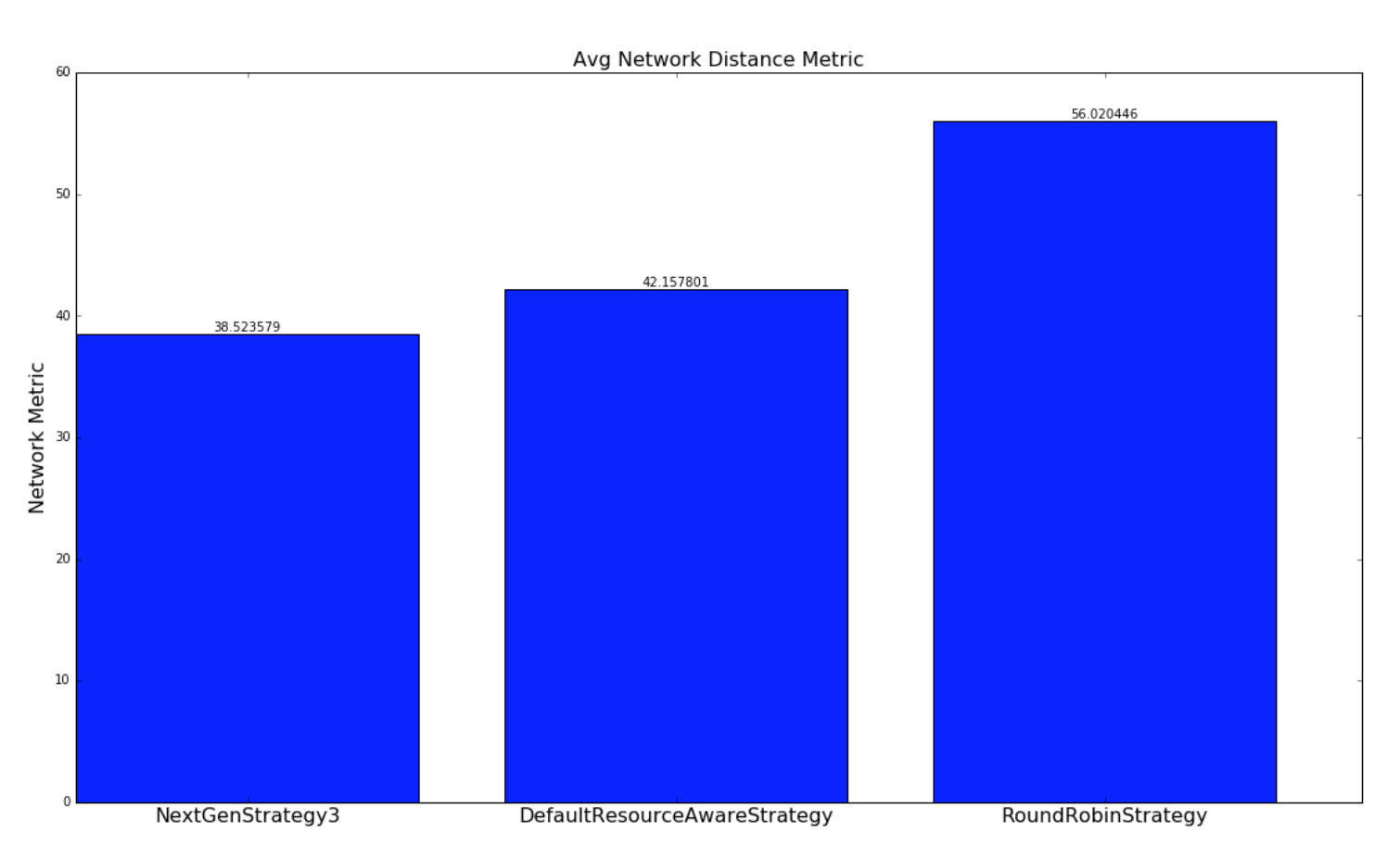 The below graphs provides a comparison of how well the various strategies schedule topologies to minimize network latency. A network metric is calculated for each scheduling of a topology by each scheduling strategy. The network metric is calculated based on how many connections each executor in a topology has to make to another executor residing in the same worker (JVM process), in different worker but same host, different host, different rack. The assumption we are making is the following